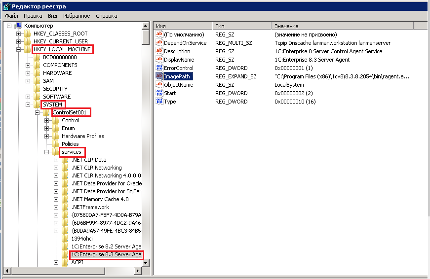 3. Знайти гілку реєстру [HKEY_LOCAL_MACHINE\ SYSTEM\ControlSet001\ services\1C:Enterprise 8.3 Server Agent\].